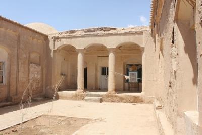 او ادامه داد: «ایوان غربی نیز با طاق آهنگ پوشیده شده و تزئینات آن گچبری است و دارای دو ورودی یکی در وسط و دیگری در گوشه ایوان یعنی شمال غرب بوده که ورودی وسط ایوان به اتاقی ختم میشود که احتمالا تابستاننشین بوده و دارای بادگیر است. ورودی دیگر نیز به اتاقی منتهی میشود که گرچه در گذشته به اتاق بادگیردار متصل بوده، اما هم اکنون جدا از آن بوده و به باغی که در پشت خانه بوده دید دارد. ورودی باغ از ضلع شمال غرب است. هم اکنون فقط فضای باغ بر جای مانده و درخت و گیاهان برچیده شدهاند. اصطبل نیز در گوشهای از باغ قرار داشته است. مطبخ بنا نیز در جبهه جنوبی بوده و پوشش آن نیز کلمبو است دور تا دور حیاط مرکزی و درست به صورت قرینه اتاقهایی وجود دارد که به هم وصل میشدهاند اما طی دخل و تصرفات توسط شخص مالک این ارتباط قطع شده است. اتاقها نیز همگی به شیوه آهنگ پوشیده شدهاند.»