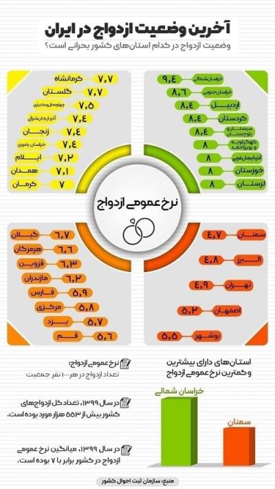 آخرین خبر: در سال ۱۳۹۹ میانگین نرخ عمومی ازدواج در کشور برابر ۷ بوده است که کمترین نرخ متعلق به استان سمنان با ۴.۷ ازدواج به ازای هر ۱۰۰۰ نفر و بالاترین نرخ متعلق به استان خراسان شمالی با ۹.۴ ازدواج به ازای هر ۱۰۰۰ نفر بوده است.