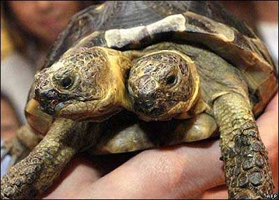 اين لاک پشت دو سر که ژانوس نام دارد ده ساله شده است و به همين مناسبت برايش جشن تولد گرفته شد. جانورشناسان مي گويند اختلالات ژنتيکي باعث تولد اين لاک پشت دو سر شده