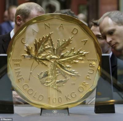 بزرگترين سکه طلايي جهان که به شکل برگ درخت افرا بوده،‌ وزني معادل 100 کيلو گرم داشته و قطر آن نيز 21 اينچ بوده است، به قيمت چهار ميليون دلار در حراجي دوروتوم اتريش چکش خورد.