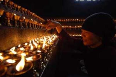 با آغاز جشن مردم چراغهاي پيهسوز را در معبد جوخانگ در مركز شهر لهاسا، مركز منطقه خودمختار تبت روشن ميكنند.