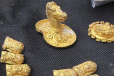در اين کاوش اشيايي طلايي شامل گردنبندهايي با سر مار، کلاهي با تصاوير حيوانات و مجسمه‌اي شبيه به سر اسب کشف شد.
