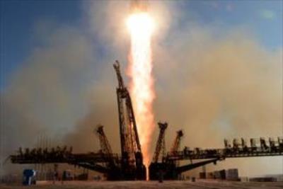 این مشعل توسط سه فضانورد روسی، امریکایی وایتالیایی در استپ های سرد قزاقستان فرود آمد.