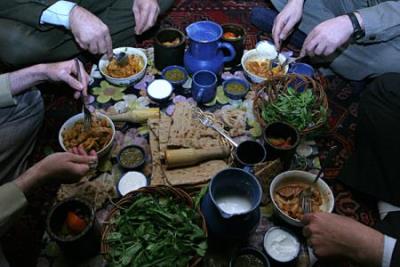 فلاح افزود: «در آشپزخانه حتماً جایی به ظروفی اختصاص دارده می‌شود که مخصوص میهمان است و فقط در میهمانی‌ها از آن استفاده می‌شود. هنگام غذا خوردن نیز بسیار به خوردن میهمان توجه دارند تا کم نکشد، و بسیار مایل هستند که در همان ابتدا بشقاب را پر و مفصل بکشی تا مبادا تعارف کنی و گرسنه بمانی. البته غذایی که جلوی مهمان گذاشته می‌شود نیز مفصل‌تر و به قولی پر ملات‌تر است.»
