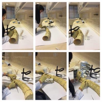 مطالعات و عملیات حفاظت و مرمت انجام شده بر این دو شئ توسط واحد حفاظت و مرمت و تزیینات وابسته به معماری سعدآباد انجام شده که شامل، مطالعات فنشناسی، ریختشناسی میکروسکوپی، مطالعات آسیبشناسی میکروسکوپی، پاکسازی و جرمزدایی تر، برداشتن برچسبهای نادرست و پاکسازی لکهای حاصل از آن، وصالی، اجرای بست ساپورت کنترل ترکها، بازسازی بخش کمبود همراه با تدابیر امور حفاظت پیشگیرانه در نگهداری در محیط مخزنی جهت ممانعت از شروع آسیب مجدد است.