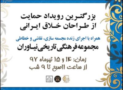 سیدرحمتالله رئوف حنان مدیر این مجموعه امروز چهارشنبه 13 تیر 97 با اعلام این خبر گفت: «در راستای نامگذاری شعار سال تحت عنوان "حمایت از کالای ایرانی" و برای حمایت از طراحان منتخب لباس سنتی و زیورآلات دست ساز، رویداد حمایت از طراحان خلاق ایرانی با محوریت صنایع دستی در مجموعه نیاوران برگزار می شود.»