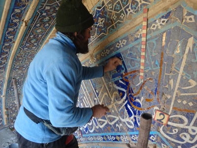 باعقیده گفت: «پاکسازی عوامل مخرب محیطی و رطوبتی ،گرد و غبار زدایی ، پاکسـازي و اسـتحکام بخشـی کلیـه سـطوح تزیینـات بـا روش فیزیکی وشیمیایی و تثبیت کلیه تزیینات پس از عمل پاکسازی از مهمترین اقدامات مرمتی در ایوان ورودی مدرسه غیاثیه است.»