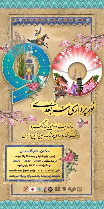 مسعود نصرتی، مدیر مجموعه میراث جهانی کاخ گلستان در این باره گفت: «سفارت ژاپن در ایران با همکاری کاخ گلستان به مناسبت بزرگداشت نودمین سالگرد برقراری روابط دیپلماتیک بین ژاپن و ایران برای نخستین بار نورپردازی سه بعدی را که بیانگر روابط دوستانه بین دو کشور است در مجموعه میراث جهانی کاخ گلستان 10 تا 11 مرداد به نمایش میگذارد. ورود برای عموم آزاد و رایگان است.»