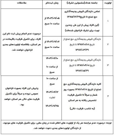 ۱- پس از اعلام کاروانها، افرادی امکان ثبتنام قطعی در گروههای اعزامی به حج سال ۱۴۰۴ را خواهند داشت که اقدام به پیش ثبتنام کرده باشند. (به استثناء ثبتنامیهای ۱۳۹۹)