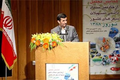 دکتر احمدى نژاد از تلاش و فداکارى همه دست اندرکاران سفر وخدمات نوروزى بویژه کسانى که لحظات تحویل سال به جاى اینکه در کنار خانواده باشند به مردم خدمت کردند قدردانى کرد وگفت :باید از همه ظرفیت هاى کشور درجهت تقویت فرهنگ گردشگرى بهره گرفته شود.