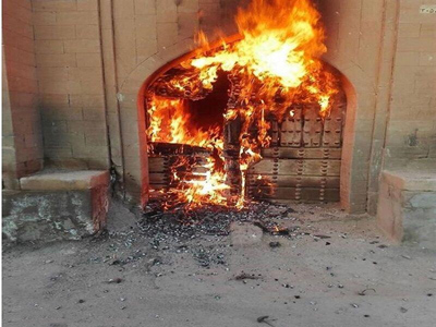 او ادامه داد: «متأسفانه صبح دیروز جمعه ششم تیرماه 99، درِ این اثر از بیرون توسط افرادی ناشناس به آتش کشیده شد که مأموران آتشنشانی بیدرنگ باحضور در محل نسبت به اطفای حریق اقدام کردند.»