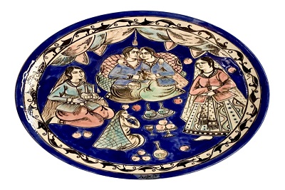 شریفزاده با بیان اینکه شبیهسازی از نقوش چهرهنگاری لوحهای قاجاری بر روی بشقاب سفالی به قطر ۳۰ سانتیمتر با روش زیرلعابی و آبرنگی توسط رعنا بهرامیفر انجام شده افزود: «نمونه حاضر برگرفته از بشقاب سفالی با طرح بزمی و از تولیدات اواخر دوره قاجار است که در تهران ساخته میشده و بیشتر بر نقوش تاریخی، سلطنتی و مضامین میدان جنگ و صحنههای روزمره و بزمی تاکید داشته و در حال حاضر در موزه هنرهای اسلامی مالزی نگهداری میشود.»