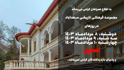 به گزارش سفرنیوز، کاخ سعدآباد از یکشنبه تا چهارشنبه تعطیل شد. کاخ سعدآباد که از روز یکشنبه هفتم مردادماه به دلیل تشدید گرما و برای مدیریت مصرف انرژی و همزمان با روز تنفیذ ریاست جمهوری تعطیل شده بود، بنا بر اعلام روابط عمومی این مجموعه، تا روز چهارشنبه ۱۰ مردادماه همچنان تعطیل خواهد بود و در روزهای دوشنبه، سه‌شنبه و چهارشنبه بازدید ندارد و بسته است. تعطیلی سعدآباد با حضور نمایندگان برخی کشورها برای شرکت در مراسم تنفیذ و تحلیف ریاست جمهوری مقارن شده است. تولیت دو کاخ در مجموعه سعدآباد، یعنی کاخ فریده دیبا (مادر فرح دیبا) و کاخ ملکه‌ مادر به عهده نهاد ریاست‌جمهوری است و این نهاد برای پذیرایی مهمانان خود معمولا از کاخ ملکه‌ مادر (معروف به ساختمان ریاست جمهوری) استفاده می‌کند. کاخ سعدآباد در خیابان ولیعصر، خیابان شهید فلاحی (زعفرانیه)، انتهای خیابان شهید کمال طاهری واقع شده و درِ دیگر آن از میدان دربند است.