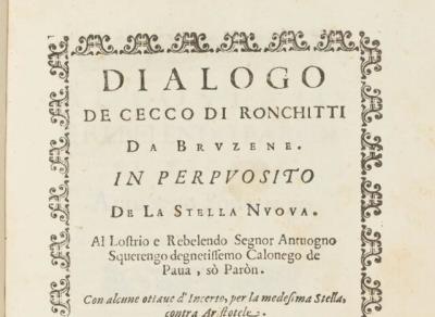 این دانشمند برجسته اخیرا با نسخهای بسیار نایاب از نخستین چاپ اثرش در اوایل قرن هفدهم با عنوان «Dialogo de Cecco di Ronchitti da Bruzene in perpuosito de la stella Nuova» رکورد جدیدی در حراج ثبت کرد. این دستاورد برجسته علم دوران مدرن اولیه، در حراج «کتابها و دستنوشتههای ارزشمند» در کریستیز لندن، در تاریخ ۹ جولای، به مبلغ قابل توجه ۱.۱ میلیون پوند (۱.۵ میلیون دلار) فروخته شد. این مبلغ تقریبا دو برابر برآورد پیش از فروش یعنی ۵۰۰,۰۰۰ تا ۷۰۰,۰۰۰ پوند (۶۸۰,۰۰۰ تا ۹۵۰,۰۰۰ دلار) بود (قیمت نهایی شامل هزینههای خریدار است، اما برآوردها چنین نیستند).