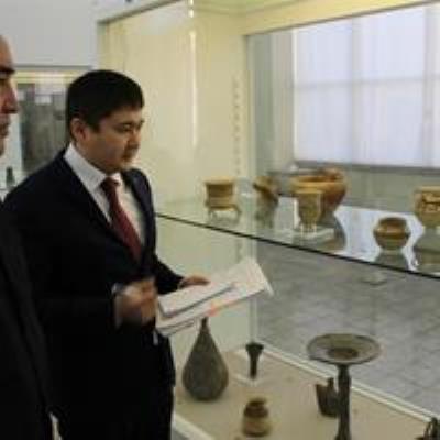 میرزاخماتوف از آثار تمدن شهرسوخته، شوش و آثار چغازنبیل، نقش برجسته، تندیس داریوش، تندیس پنلوپ وسرستون تالار هخامنشی، بزرگ زاده پارتی، مومیایی مرد نمکی و آثار شیشهای تالار اشکانی و در نهایت فلزکاری و گچبریهای دوره ساسانی، با توضیحات فیروزه سپیدنامه مسئول موزه ایران باستان بازدید کرد.