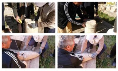 معاون میراثفرهنگی استان خوزستان افزود: «به منظور بندکشی و مقاومسازی قطعات آسیب دیده، ترکیبی از ماسه و سیمان همراه با پودرسنگ با درصد اختلاط مشخص ملاطی تهیه شد.»
